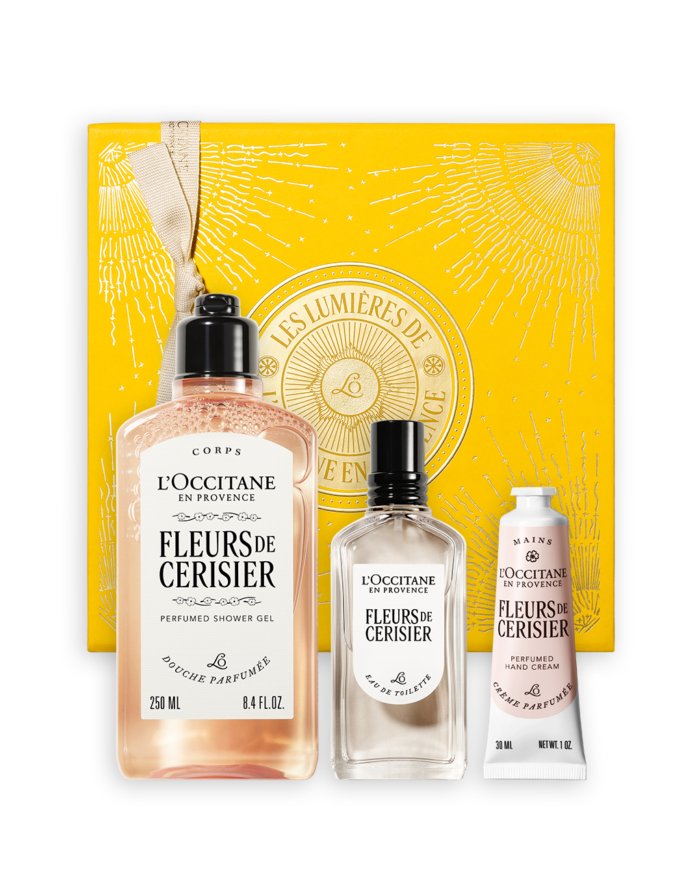 Et feminint sett med parfyme og kroppspleie fra vår Fleurs De Cerisier, tidligere Cherry Blossom, som har en søt og delikat duft av kirsebærblomst. Settet inneholder: Fleurs De Cerisier Eau De Toilette 50ml, Fleurs De Cerisier Shower Gel 250ml og Fleurs De Cerisier Hand Cream 30ml.